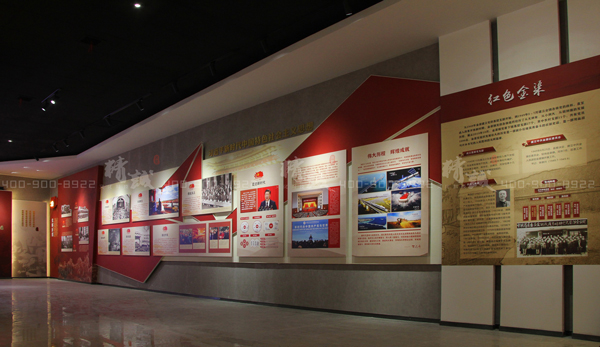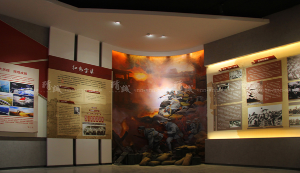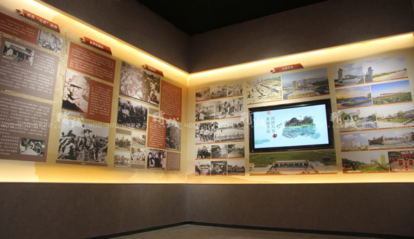 墻面展板通過(guò)圖文方式展示了金渠古鎮(zhèn)人杰地靈的燦爛文化和歷史榮耀,同時(shí)通過(guò)半景畫(huà)場(chǎng)景搭建引出紅色金渠的革命史、滄桑巨變發(fā)展史,搭載電子觸摸屏,通過(guò)互動(dòng)形式了解關(guān)于金渠更多紅色歷史。